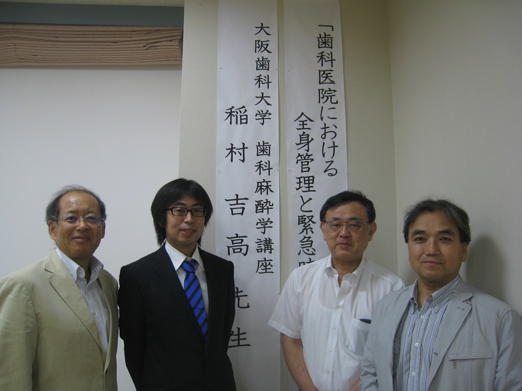8月3日(土)和歌山県歯科医師会にて平成25年朝日大学歯学部和歌山県人会・学術講演会が開催されました。講師に大阪歯科大学大学院講師、稲村吉高先生をお招きし 「歯科医院における全身管理と緊急時の対応」という演題でご講演いただきました。高齢者時代を迎え、有病者の方の来院が増えております。稲村先生は今日の命題である医療の安全のため、モニタリングがいかに重要かをわかりやすく解説してくれました。また、緊急時の対応や、薬剤の使い方など、明日から臨床に役立つ貴重なお話ばかりでした。
